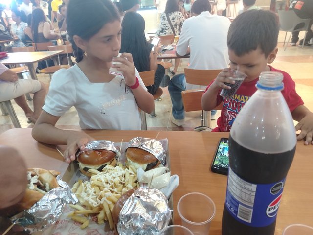 Después de pasar varias horas jugando, nos dirigimos a la parte de las comidas y como ella quería comer hamburguesas eso fue lo que pedimos, acompañadas de refresco y unos ricos helados, porque tuvimos suerte al conseguir una promoción que incluia 4 hamburguesas, 4 helados y el refresco.Terminamos de comer, reposamos y agarramos rumbo a la casa, ya saliendo de Barrancabermeja tuvimos que regresarnos y agarrar otro atajo porque estaban los agentes de tránsito fregando en la vía.