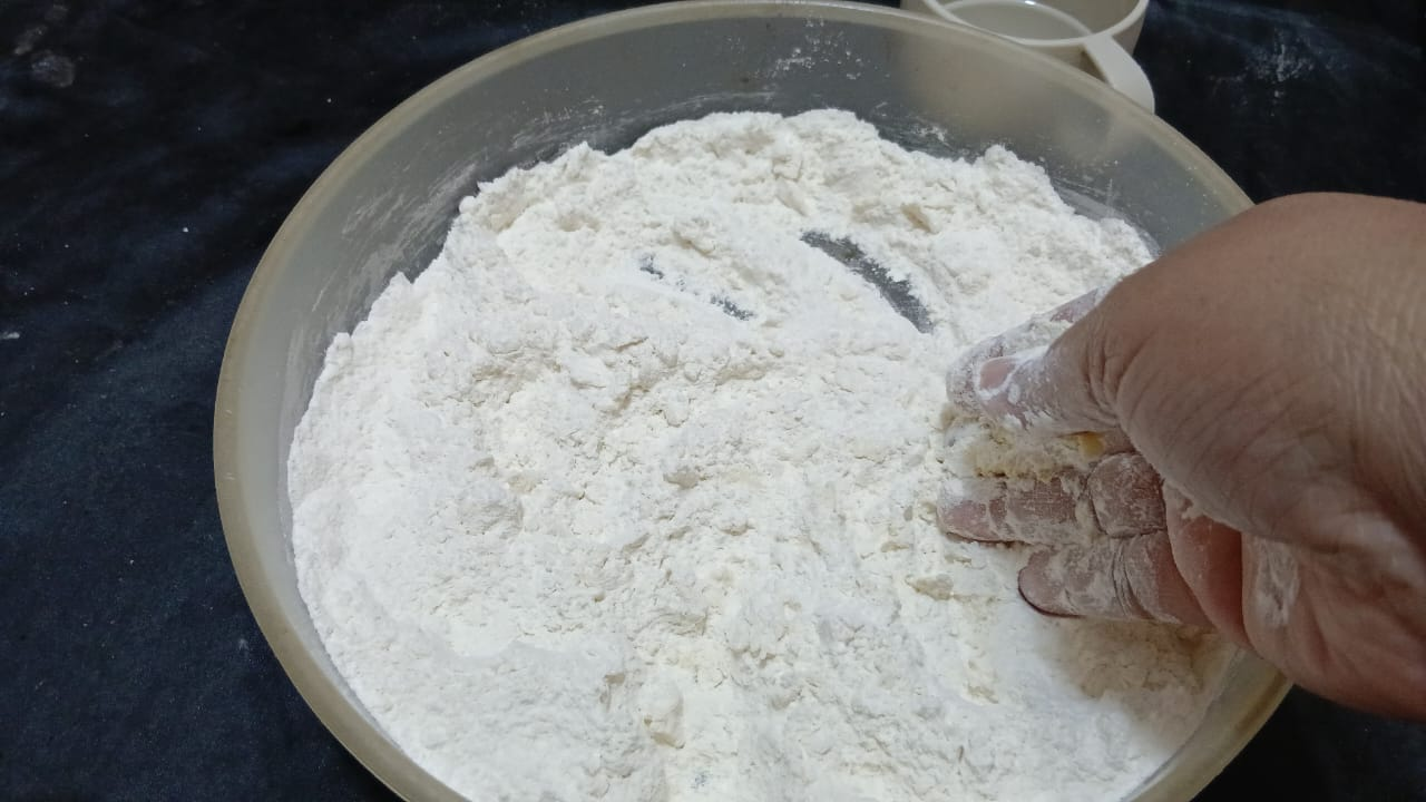 -Luego de pesados o medidos los mismos lo llevamos a un bol o envase plástico de preferencia bien limpio y seco, colocamos la harina y hacemos el volcán en el centro.