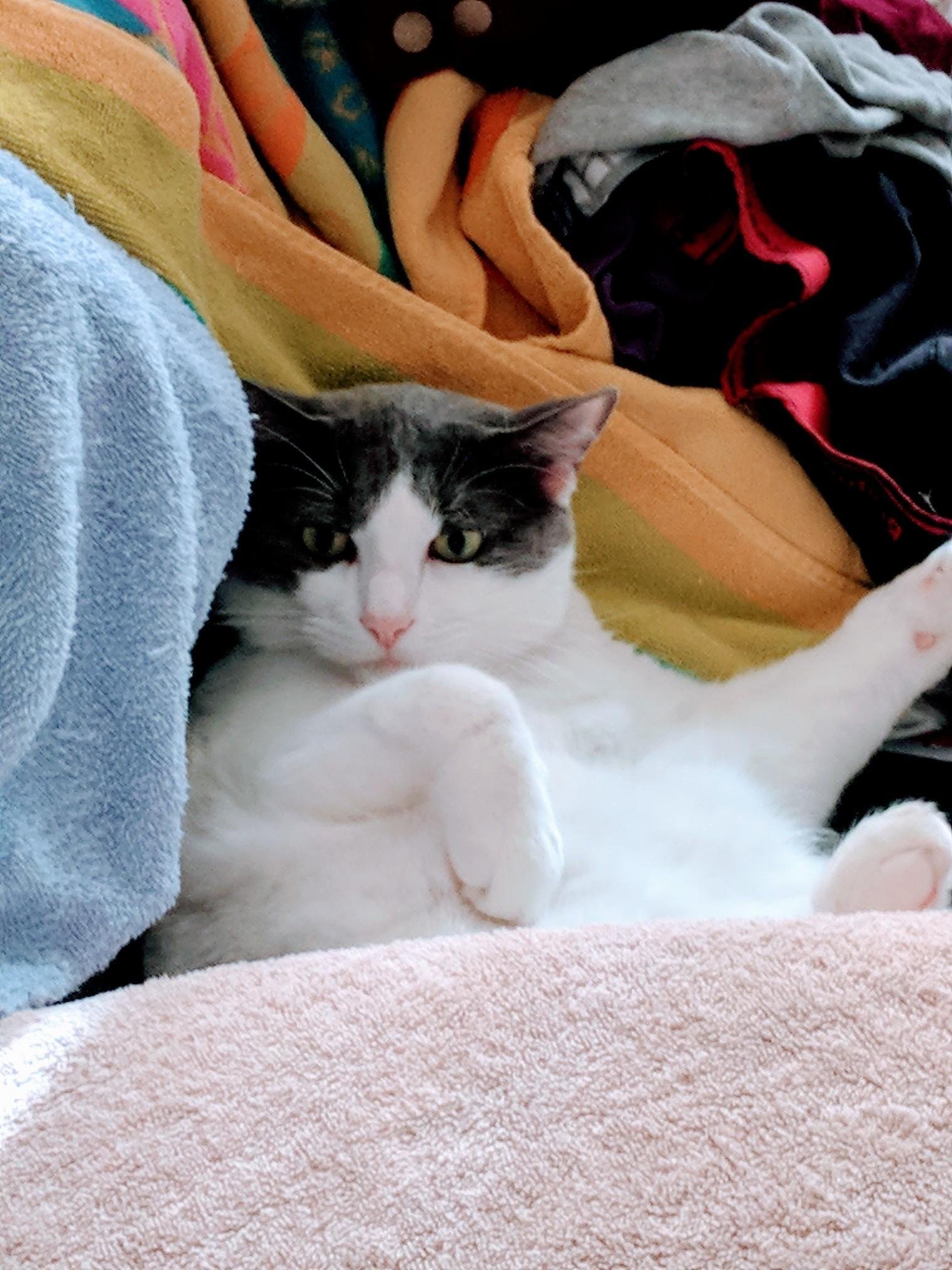 Look who I found chillin' on a warm pile of laundry, fresh from the dryer... sweet Dexter. This picture represents a cat's life.