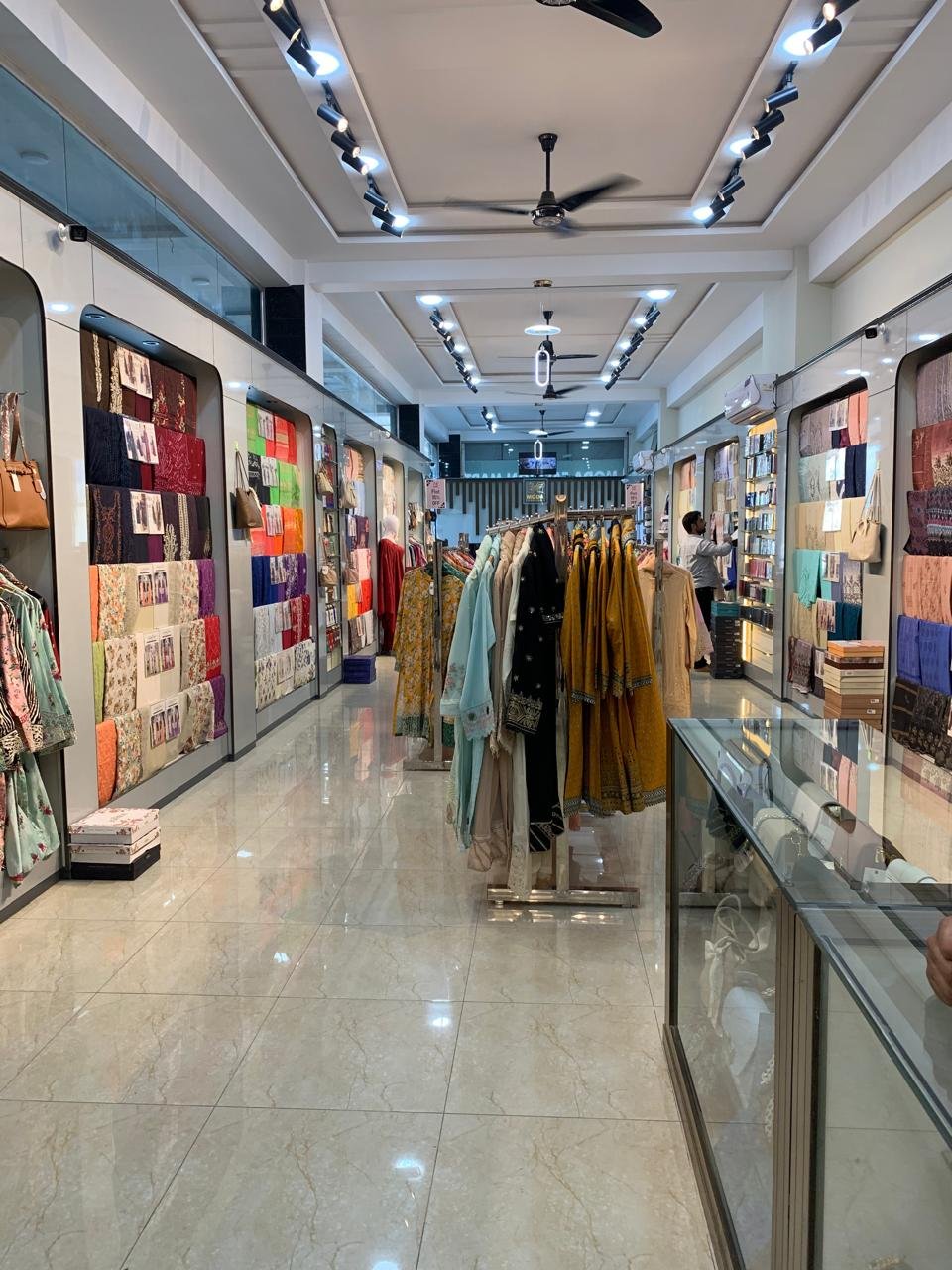 women stitches clothes casual wear party dresses and embroiderd suits are neatly hung in lines. they also have low price and the best qualities are thereThe colors and designs are eye catching. mens Unstitched Fabrics For men there is a separat corner with unstitched fabrics of different qualities and price ranges.