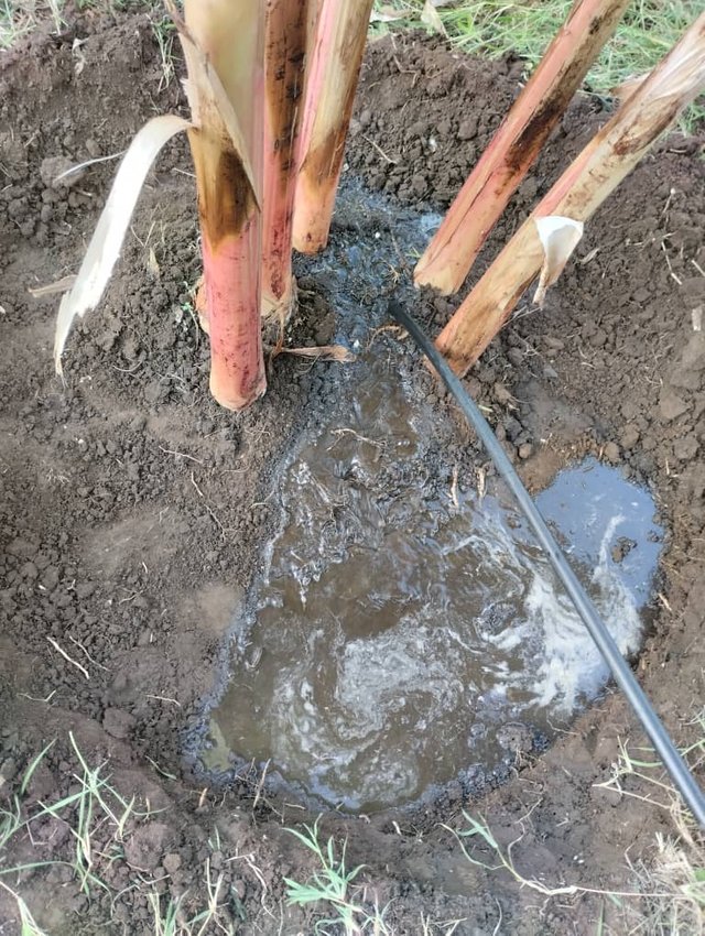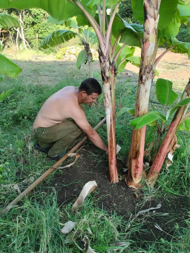 Enseguida los resguarde para continuar con el trabajos de limpieza. Así fui retirándo el monte en casa pie de las matas. Luego poye un poco en mover la manguer6para ir regando las matas, cuyo espacio o pie ya estaba limpio.