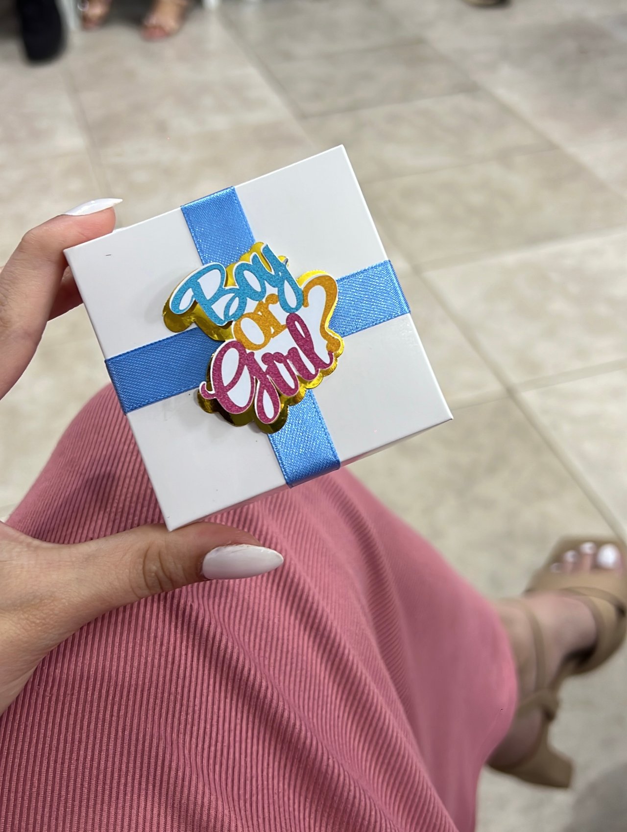 Nos dieron una cajita misteriosa, que solo podíamos abrir cuando se anunciara el sexo del bebé. Pero claro, la caja estaba tan bien asegurada que nadie podía adelantarse, y todos nos moríamos de la intriga. Cuando por fin se dio la señal y logramos.