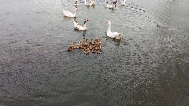 Está el grupo de las madres con los gansitos pequeños los rodean y los cuidan bastante no los dejan solos ni un instante y tampoco dejan que los machos se les acerque me imagino para que no los maltraten, al vernos estaban lejos y luego se fueron acercando para ver qué les dábamos de comer.