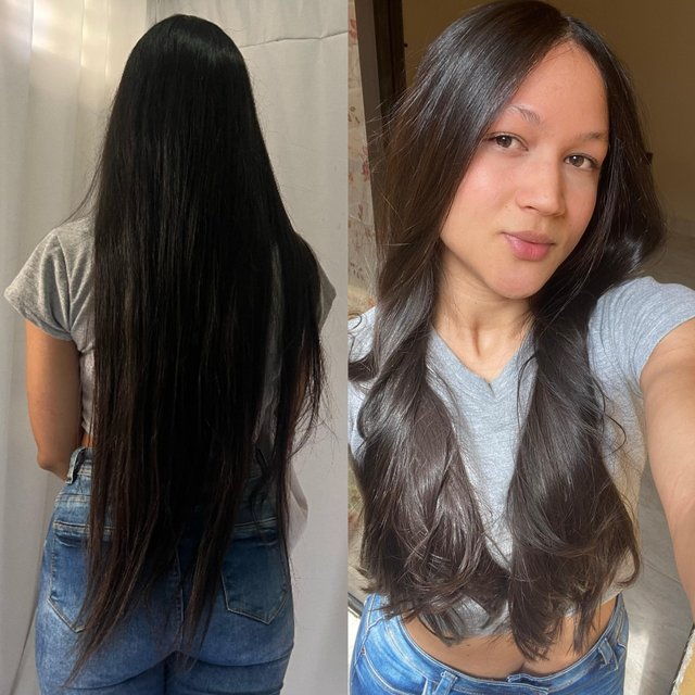 Me tomé una foto antes de salir de casa para ver cuan largo tenía el cabello, la idea era cortarme todo lo malo, pero es que lo tengo reseco y abierto como hasta la mitad, en principio pensé cortarmelo recto, luego pensé, no, muy aburrido jaja. decidí hacerme como especie de grafilado en las puntas pero solo dos capitas, yo solamente le ensené la foto a mi amigo y en menos de 10 monutos ya estaba lista, le pagué de una vez para que me lo secara para ver como me había quedado y debo decir que me encantó, mis amistades atacadas porque me lo corté pero siento que ya parecía una viejita con esos cabellos así, además de lo maltratado que estaba. Me devolví bien feliz para mi casa, tenía realmente mucho tiempo que no me sentía linda auqnue parezca loco jajaja, pero es verdad.