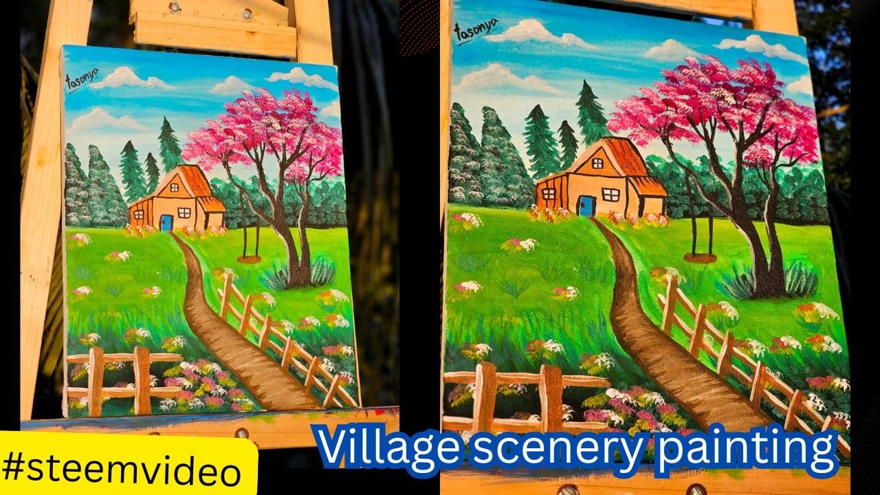 Hoy les compartiré otra pintura muy hermosa. En esta pintura, presenté una escena muy hermosa. La presenté como si fuera una escena real. Hay casas, árboles y naturaleza verde. Hay un camino muy bonito frente a la casa, y presenté una escena muy hermosa. Hay césped verde y un entorno precioso. Me gustó mucho esta pintura. Dediqué unos dos días a pintarla. Intenté lograr una combinación de colores muy hermosa en dos días. Espero que les guste.
