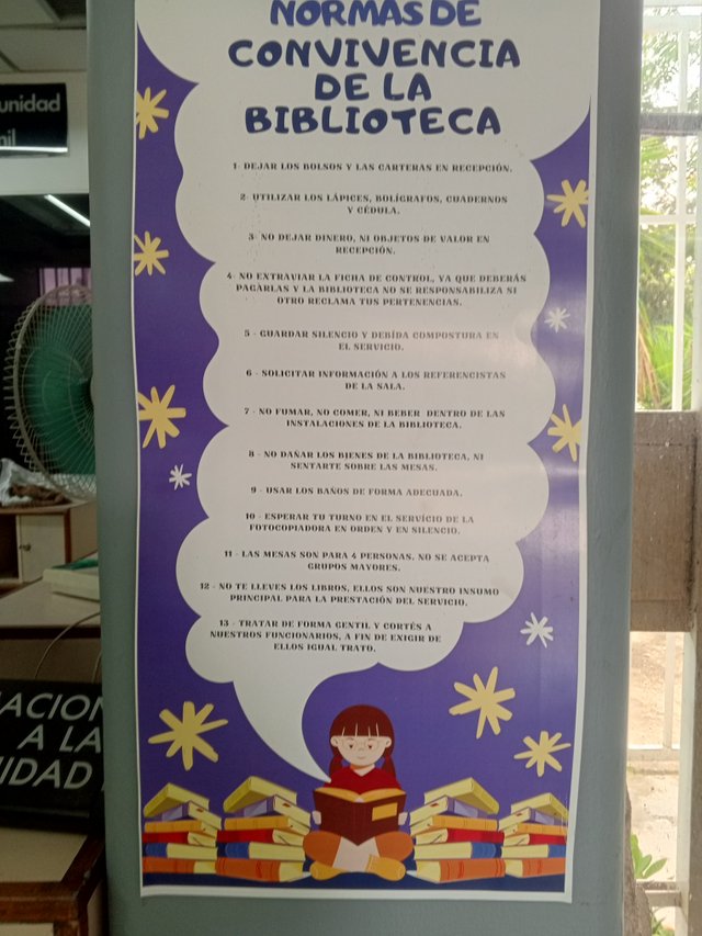 En cada piso hay un personal encargado del área muy amables atentos a ofrecer la información que necesitas la biblioteca es espaciosa, pero no cuenta con aire acondicionado ni ventilador, lo que puede ser sofocante, en cada mesa esta detallada las normas de los usuarios, los libros que uses debes dejarlo en la mesa y el encargado lo coloca nuevamente en su lugar.