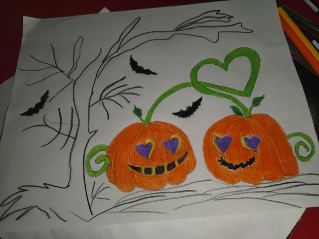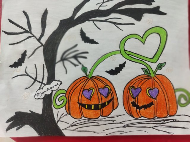 Comencé creando el diseño a lápiz, para luego dar y profundizar los colores: Se trata de dos Calabazas con ojos en forma de corazón, quienes se encuentran bajo un árbol escalofriante, y con unos pequeños murciélagos deambulando encima de ell@s, pero que a pesar de todo el miedo que los rodeaba, al verse el amor surgio haciendo que sus raíces crecieran y se unieran creando un corazón entre ambas.