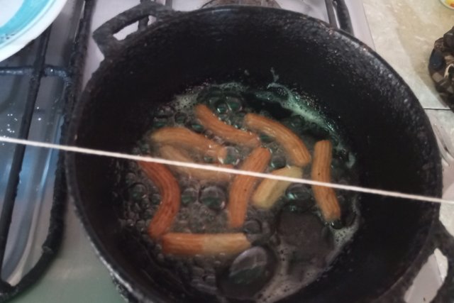 La llevamos a una manga pastelera, con la boquilla rizada. Y en el aceite caliente procedemos a freír los churros directamente