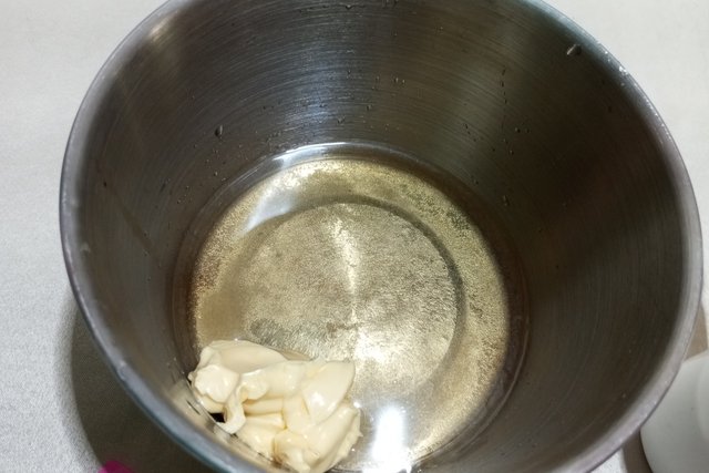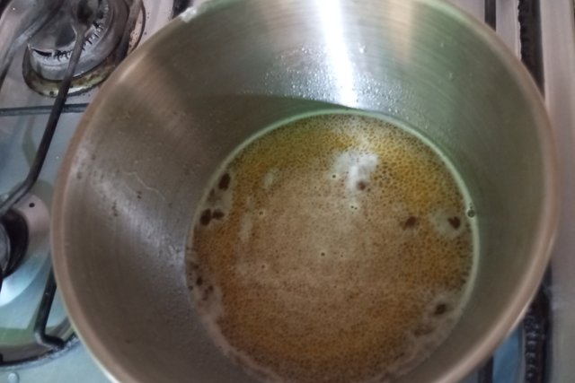 El primer paso es colocar la mantequilla con el agua y la esencia de vainilla en una olla hasta hervir.