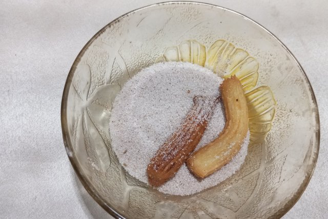 Se le retira el exceso de aceite y se bañan con el azúcar y la canela.