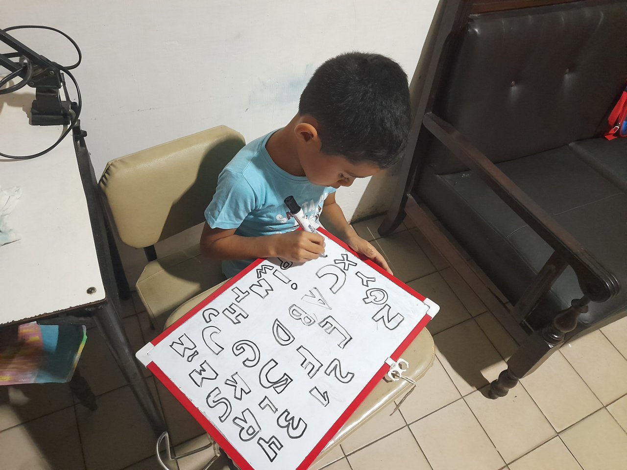 Gracias a Dios el carro se porto bien y di 3 vueltas y no produjo mas la falla, llegue a la casa a eso de las 7pm y me encontre a Thiaguito bien concentrado haciendo el abecedario es una pizarra acrilica que le compramos hace varios meses.