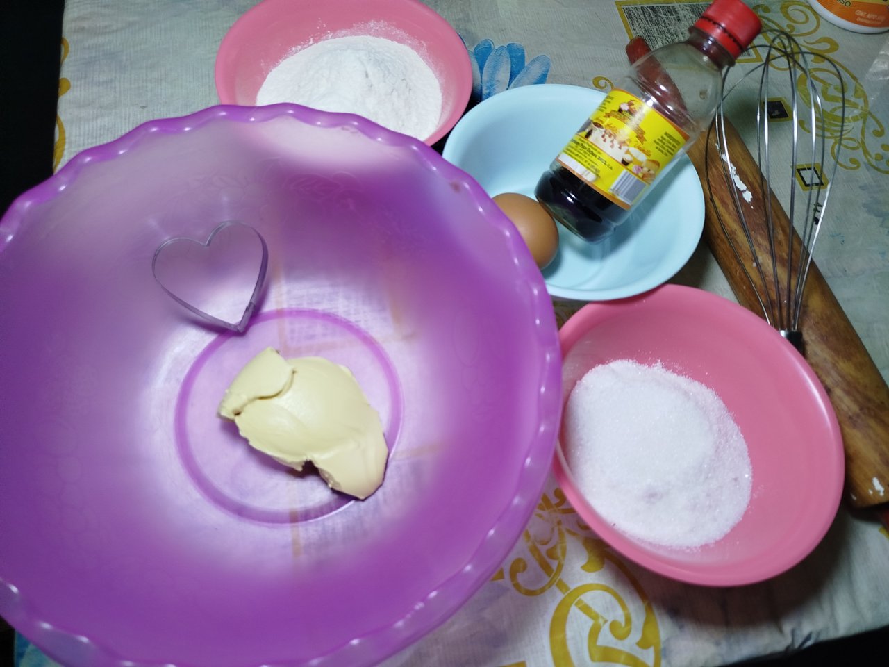 Los ingredientes son: 115 grs mantequilla, 1 taza de azúcar, 3 tazas de harina de trigo leudante, 1 cucharadita de vainilla, 1 huevo, (Cortadores de galletas forma corzón, Batidor, rodillo).