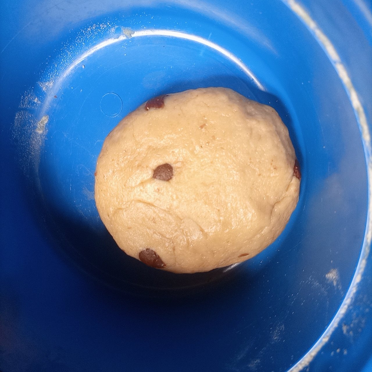 In another bowl I added flour, ground cinnamon, sugar. Vanilla essence, baking powder, butter and egg mixed them together and knead till I got a smoot dough then I poured in few chocolate chips knead a little and allow in rest.