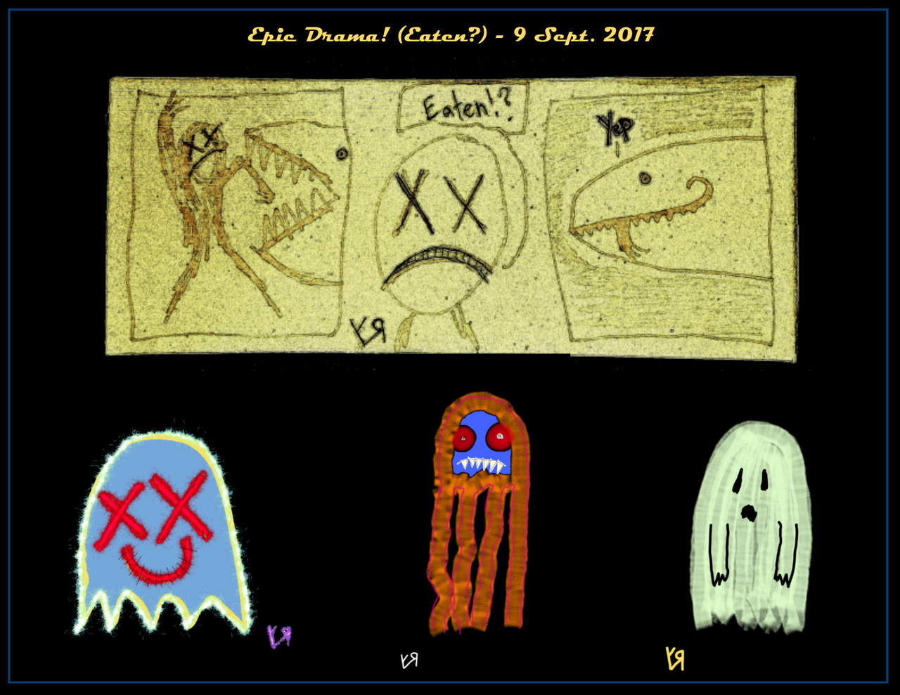 SOMETHING HUNGRY is stalking the waters, making ghosts out of jellyfish and divers and other folks who venture into the DEEP WATERS! (The fools...) I've become, somewhat recently, enamored with the concept of BAD COMICS. I want to see how sketchy, how nonsensical, and how BAD a comic can become but still work as a comic. (I'm inspired here by things like Scott McCloud's UNDERSTANDING COMICS, which stated that simplification of an image can make it more relatable for the reader. Is this necessarily true? I don't know, but it's fun to play with the ideas!) (Plus, I like to draw ghosts...so there's that element, too.) I'm only making one edition of this piece available as a work of crypto-art, but I'm printing a handful of the pieces (on paper) to sell in my front yard during my summertime "yard art" sales, which I put on every year. (But we all know, the person who buys the CRYPTO piece has the REAL work!!! We all know that, don't we?) Okay. Thanks for playing!
