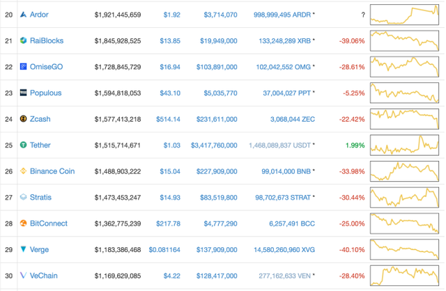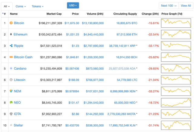 The value drop is having a tremendous effect. As per Coinmarketcap.com, a site that is rapidly turning into the go-to value checker, only one of the best 100 most astounding esteemed digital forms of money isn't in the red in the course of recent hours. That is Tether.