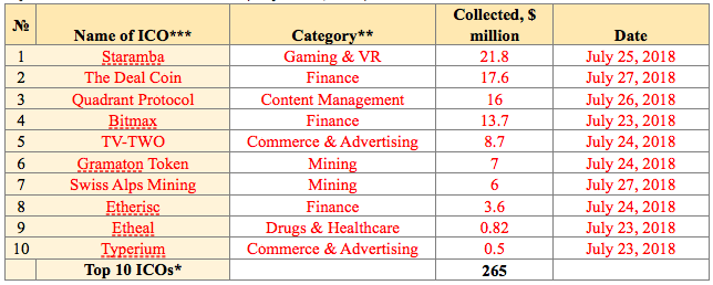 During the analyzed period (July 23-29, 2018) at least 11 ICO projects were successfully completed, each of which collected more than $100,000, with the total amount of funds collected equaling more than $96 million. Last week’s leader was the Staramba project, which collected $21.8 million. The total amount of funds collected by a number of ICOs failed to reach even $100,000 (the information for some projects is still being finalized).