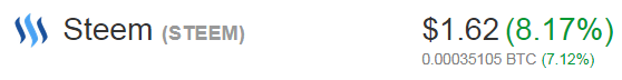 Steem's most recent high peaked around $2.52 which is approximately 35.7% lower than the currency price of $1.62, also compared to other cryptocurrencies Steem currently has a low volume of no more than $3.2 Million, the last increase had this coin at $50 Million volume. Consequently, we know that Steem has huge potential for an upsurge in price.