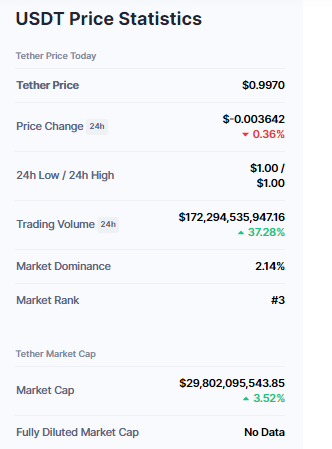 USDT is a stable-value cryptocurrency or stable coin. It mirrors the price of the U.S. dollar. The token’s peg to the USD is achieved via maintaining a sum of dollars in reserves that is equal to the number of USDT in circulation. Tether price today is $1.00 USD. It has a circulating supply of 29,754,571,162 USDT coins and market capitalization of $29,802,095,544 USD.