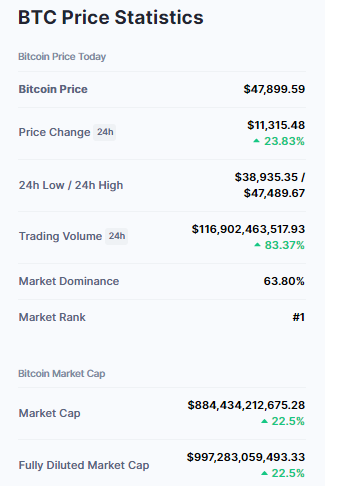Out of the total market capitalization of cryptocurrency, 63.80% is dominated by Bitcoin (BTC), and its current value stands at $47,684.24, circulating supply at 18,623,718 BTC. The circulating supply is the number of bitcoins or any cryptocurrencies that are in the public hands. The credit goes to its exponentially growing asset value. With Bitcoin (BTC) being endorsed by the world’s richest person on the planet, it deserves to be on the top of the list.