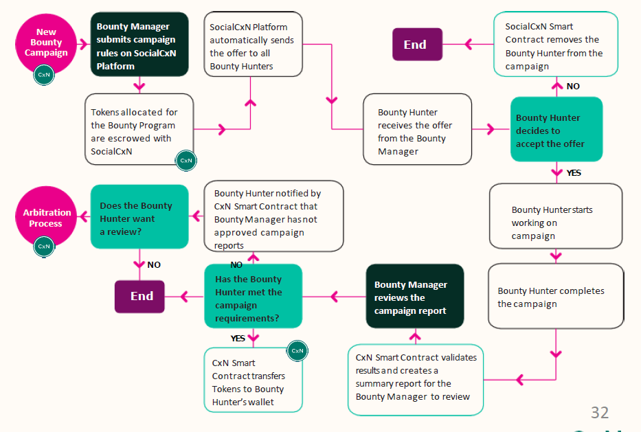 Social CXN creates a platform that allows bounty managers to create bounty campaigns with set rules. The tokens allotted for the bounty are escrowed to ascertain the payments of all accepted works by the hunters. The bounty campaign is then made available for all bounty hunters to see and apply. The bounty hunter applies for the bounty, works on the bounty, and finishes the campaign. The smart contract checks or validates the work done and creates a summary report for the bounty manager to review. The bounty manager reviews the summary reports and accepts or rejects the work done by the hunter. If the work done by the bounty hunter is accepted, the hunter is automatically paid through the smart contract into the hunter’s wallet. If the work is not accepted the hunter is notified, but if the hunter wants a review, then the arbitration process is initiated.