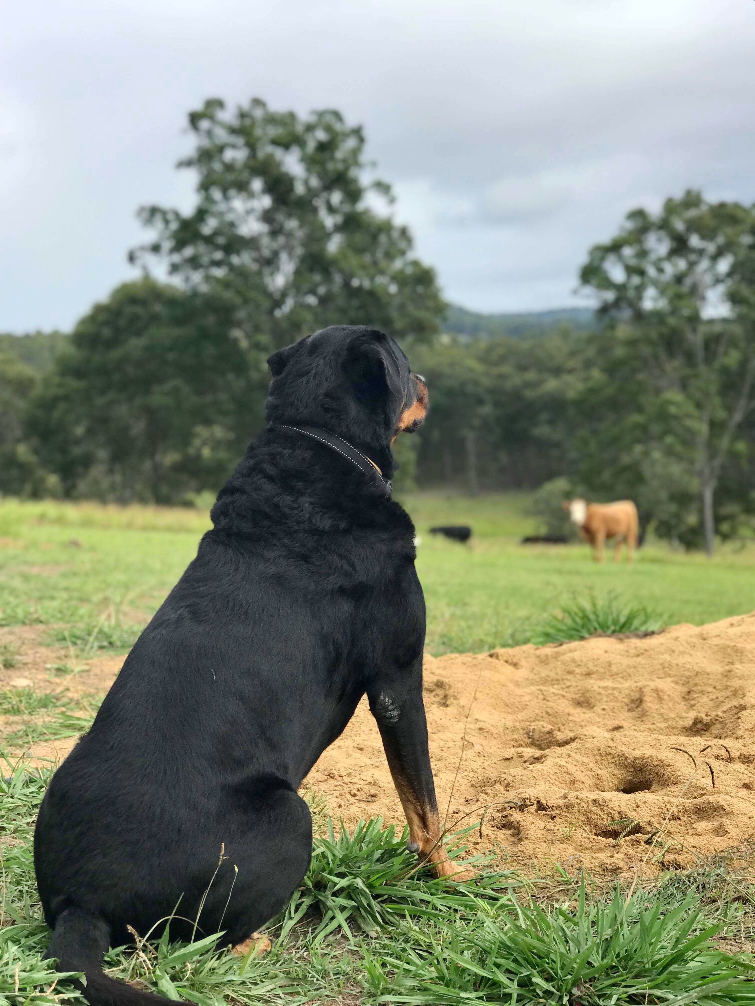 Zeus the Rockweiler my nephew's dog who lives on a farm in the outback of Sydney , Australia is the caretaker , bodyguard and security dog over looking the herd of cows on the farm as well as the family and the two kids he definitely has his work cut out for him but is rewarded with lots of love , hugs and treats and is real beautiful pleasant Rockweiler to be around.