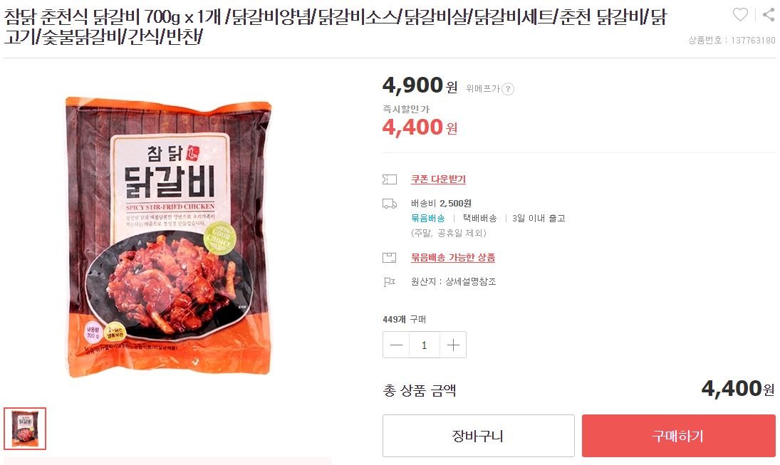 [쇼핑정보] 참닭 춘천식 닭갈비 700gdalki3768 (53)in #dclick • 7 years ago 안녕하세여 ~~ 참닭 춘천식 닭갈비 700g 1개당 4,400원에 배송비 2,500원 위메프 괜찮타고해서 5개 구매해보았습니다~~ 개인적으로 닭갈비를 좋아해서 ㅎㅎ 즐거운 쇼핑하세여~~ Sponsored ( Powered by dclick ) #busy #jjangjjangman #kr #life