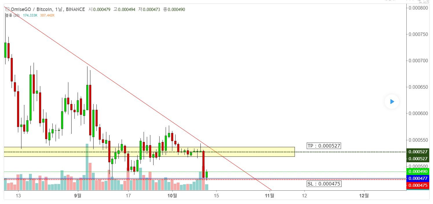 오미세고 - 하락 삼각형 패턴. TP1은 저항선, TP2는 매몰대 부근에 설정. 손절선은 애매했음.