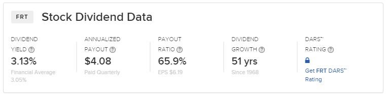 아래는 현재 편입을 고려하고 있는 Federal Reality Investment Trust[FRT]입니다. 연간 배당수익률은 3.13%이고, 연간 $4.08를 분기로 배당하며, 51년 연속 배당을 성장시켰습니다. 배당성향은 65.9%입니다.