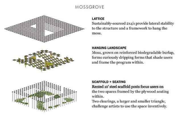 THE PROJECTMossgrove is a proposal for an architectural pavilion to be built in Times Square during NYCxDESIGN from May 12-20, 2018. It highlights the possibilities of two under-appreciated urban elements: scaffolding and moss. Individually, scaffolding and moss are both considered nuisances or visually unappealing. Together, they form a bio-mechanical partnership that challenges us to view the most ordinary materials as having extraordinary potential.Full project description below:Scaffolding has an outsized presence in NYC, creating a network of informal porticos between the buildings it covers and the street. Cast as an aesthetic and spatial nuisance, the ubiquity of scaffolding and the informal passages it creates present an opportunity to expand its role beyond the construction industry and assert itself as a framework for informal social gatherings. Easily missed but equally widespread, moss occupies a different scale of ambiguous urbanity- the caulking in between sidewalk flags, the stucco wall that stays wet after a storm, or the neglected corner of a window sill. These tiny sparks of green within the vast grays and browns of New York belie the intelligence of a biologically advanced organism that has remained essentially unchanged for millions of years. Spatially, moss is a formal chameleon, fuzzing the edges of objects it coats but never staking a position of its own. By granting moss a formal agency and the visual high ground, traditional assumptions of technical and aesthetic qualities can be upended.Mossgrove seeks to highlight these spatial misfits of the urban architectural theater by elevating their formal and programmatic agency, placing them at the forefront of the 2018 Design Pavilion NYC.Thank you in advance to all of our backers, and we'll see you NYCxDESIGN May 12-20, 2018!THE TEAMSam Biroscak is a designer based in New York City. He was a finalist for the Figment 2018 City of Dreams Pavilion and was on a finalist team for the Flint Flatlot Competition in 2013. He has an M.Arch from Rice University and currently works for the Office for Metropolitan Architecture (OMA).Gina Dyches works in the development and events department at the Brooklyn Academy of Music (BAM). A classically-trained violinist, Gina is well-versed in fundraising, logistics, and production coordination.Stephanie Borchers, SE graduated from MIT with a Masters in High Performance Structures and from the Cooper Union with a B.Eng. She belongs to the Society of Women Engineers and the American Society of Civil Engineers. She is currently employed at Forell/Elsesser Engineers.Special thanks to Annick Lang and Anneli Rice for their extensive efforts on moss research and pavilion construction during the competition submittal in 2017 and to Sam Warga, Sam Lazarus, and Kevin Doherty for their contributions to the video.