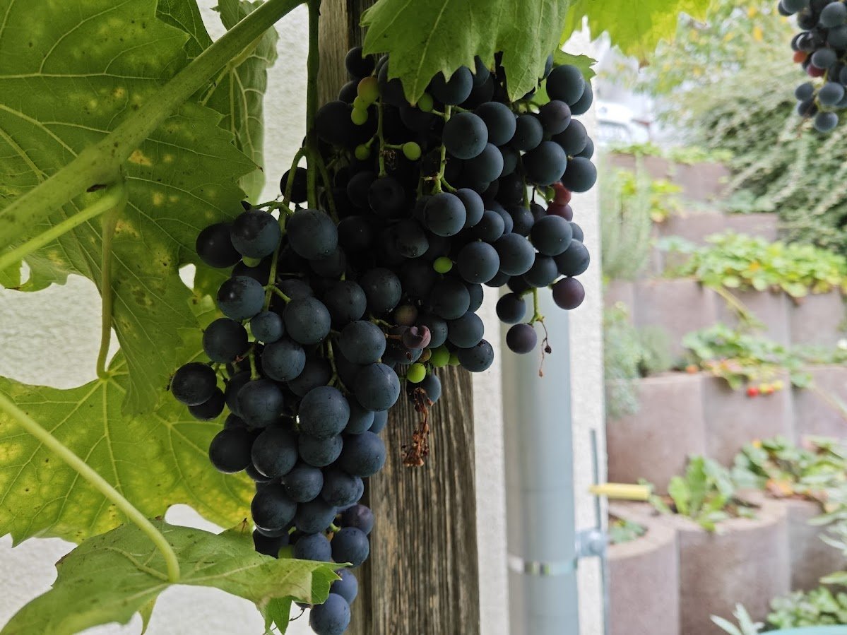 Weintrauben ernten wir seit Mitte September. Noch hängen viele am Spalier – inzwischen auch gern von Wespen und Vögeln besucht. Morgen werde ich ein Netz darüber spannen. Ich hoffe, noch bis Mitte Oktober ernten zu können.