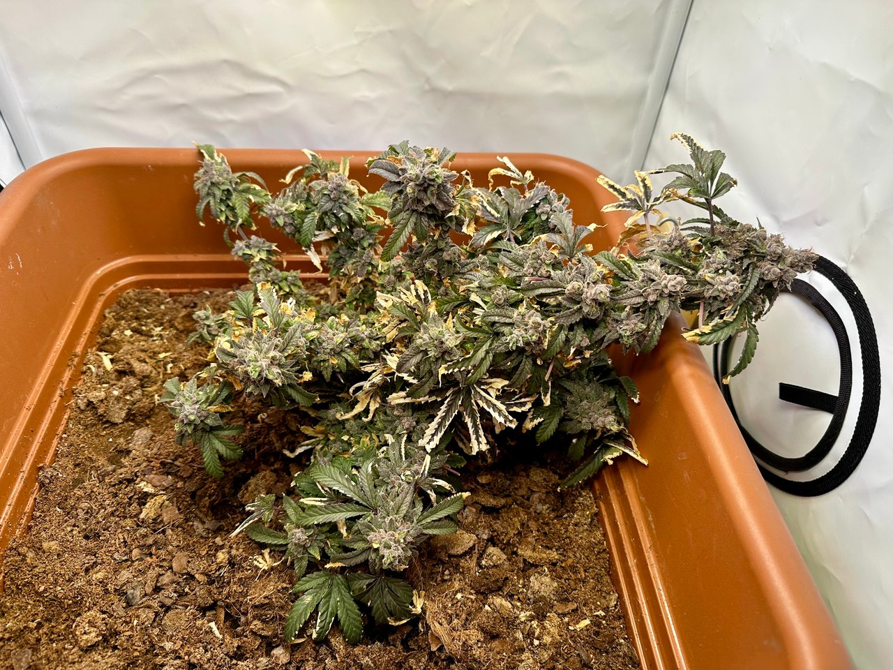 Der Grow ist fertig. Es war ernüchternd, die Growshop- Erde war großer Schitkram. Ich habe eine der Pflanzen draußen im Gewächshaus, in billigste Baumarkterde gesetzt.