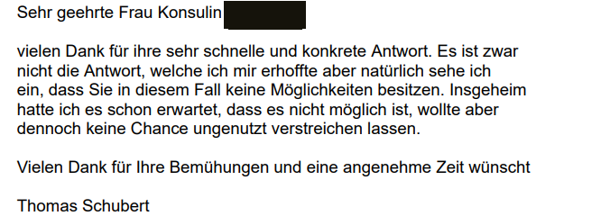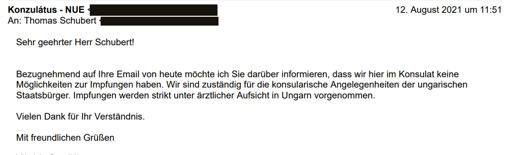 Leider sehe ich keine Möglichkeit an eine solche Impfung in Deutschland heranzukommen und das Land werde ich schon gar nicht verlassen. Meine aktuell letzte Idee war eine Impfung im ungarischen Konsulat aber das ist leider nicht möglich :(