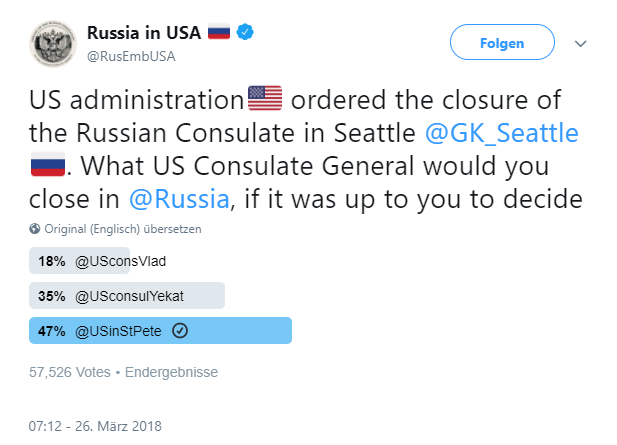 Ich halte nicht viel von den ganzen Ausweisungen der Diplomaten. Egal ob es von den USA, einzelnen europäischen Staaten oder Russland kommt. In solchen Zeiten sollte man immer auf den Dialog setzen und es vernünftig klären. Zumindest sollte man es von Politikern erwarten. Ich schätze mal, dass kein normaler Bürger sich auf einen möglichen Krieg freut. Nun macht Russland auch mit und schließt das US-Konsulat in Sankt Petersburg. Natürlich war das jetzt auch nur eine Reaktion auf die Ausweisungen der russischen Diplomaten in anderen Ländern. Ob es nun richtig war oder nicht, darf jeder für sich selbst entscheiden und bei den ganzen negativen Schlagzeilen und Anschuldigungen der letzten Jahre, die Russland betreffen, muss ich persönlich sagen, dass Herr Putin noch sehr gelassen reagiert.
