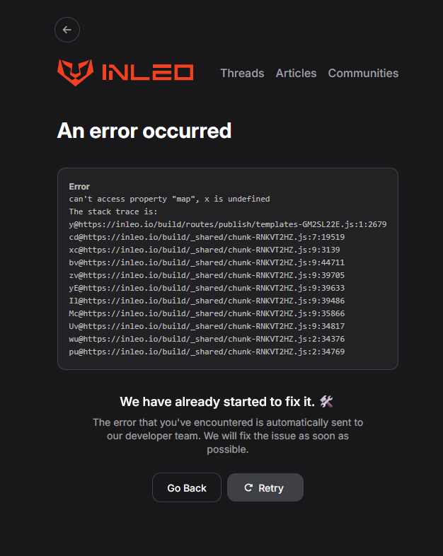 Mal wieder komme ich bei Inleo nicht in die Templates rein, denn es kommt eine Fehlermeldung