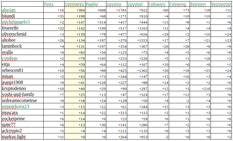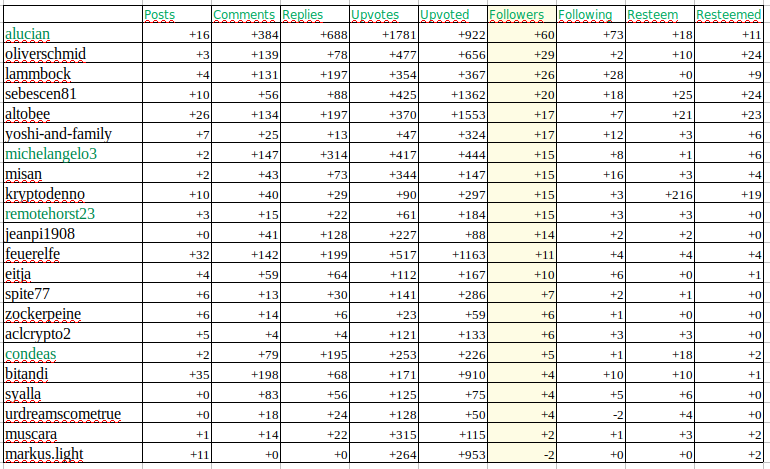 In der Kategorie neue Follower teilen sich die ersten drei Plätze @oliverschmid, @lammbock und @sebescen81. Auch hier, die Zahlen sind nur ein Anhaltspunkt. Interessant sind natürlich die Verfolger, dicht dran sind @altobee, @yoshi-and-family, @misan, @kryptodenno, @jeanpi1908, @feuerelfe und @eitja. Neue Follower sind schon ein gutes Zeichen!
