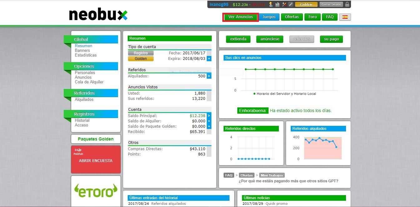 Neobux es una página que te paga por ver anuncios. Todos los días te dan una cantidad determinada de anuncios de los cuales unos son obligatorios para recibir las comisiones de tus referidos al día siguiente. Ahora hablaremos de los referidos. Los anuncios obligatorios son éstos: