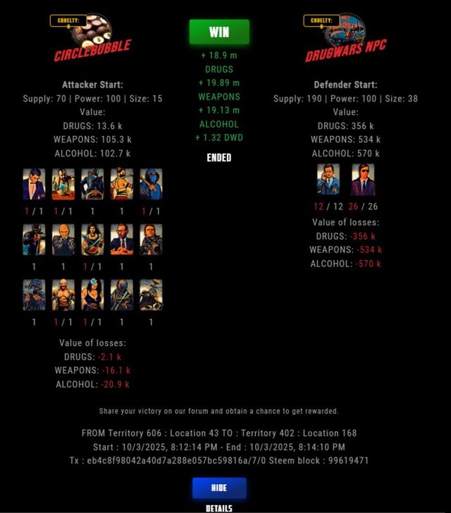 Check my latest fight ! circlebubble vs The Govermentcirclebubble (75)in DrugWars • 7 hours ago #drugwars-fight #gaming #fight #dw