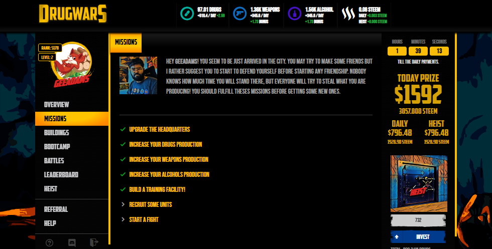 What should I do once I’m in the game?You should head over to “Missions” located on the left bar menu and start the missions to get a heads up on what is going on in DrugWars.