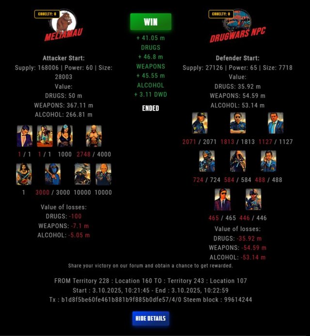 Check my latest fight ! meliamau vs The Govermentmeliamau (61)in DrugWars • 11 hours ago #drugwars-fight #gaming #fight #dw