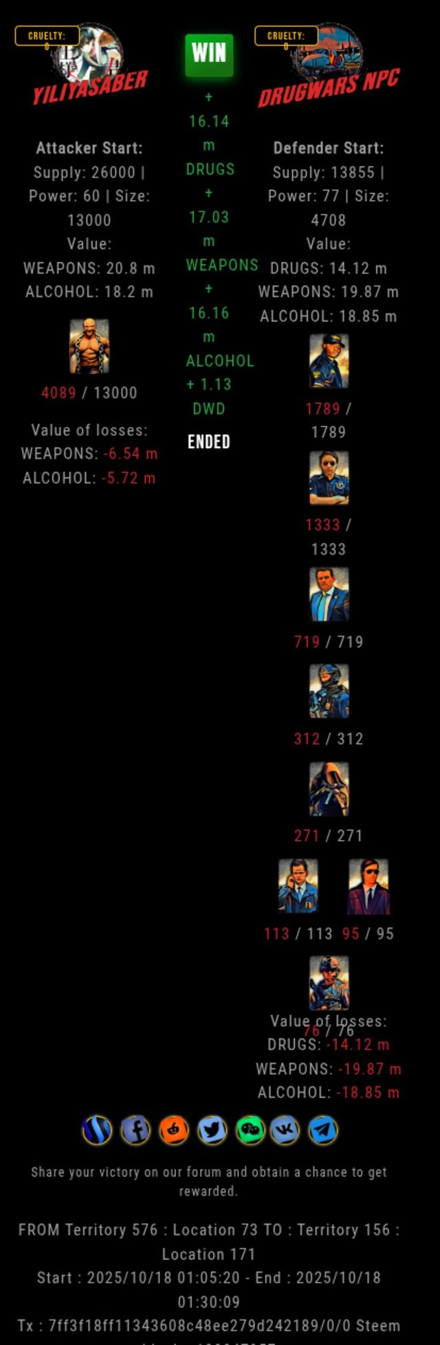 Check my latest fight ! yiliyasaber vs The Govermentyiliyasaber (69)in DrugWars • 11 hours ago #drugwars-fight #gaming #fight #dw