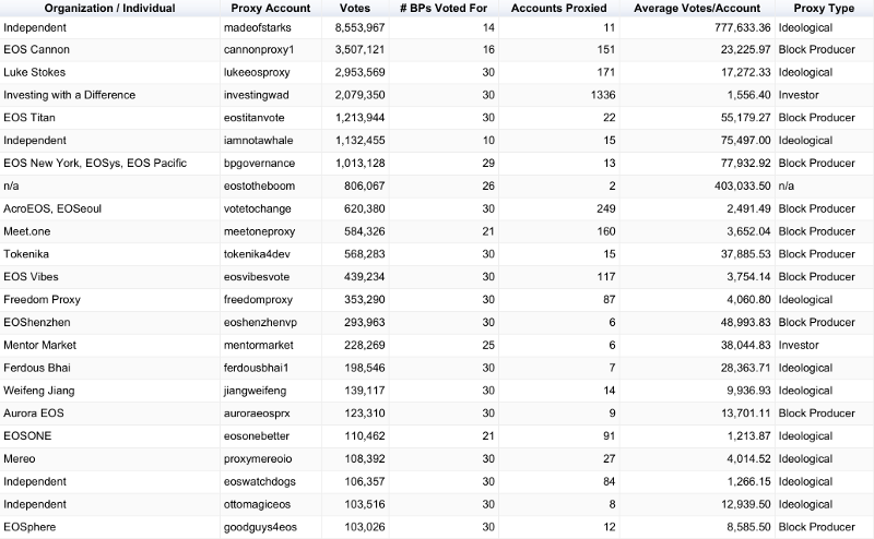 Ниже приведена таблица, в которой перечислен каждый зарегистрированный прокси с силой голоса, эквивалентной более 100 000 EOS. Существуют несколько переменных, на которые нужно обратить внимание, чтобы оценить состояние экосистемы прокси (не стесняйтесь экспериментировать с данными здесь).