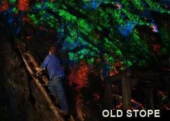 The two mines are also world famous for their fluorescent minerals, and the area is known as the Fluorescent Mineral Capital of the World. Just over 90 unique mineral species have thus far been documented as fluorescent. Specimens from Franklin and Sterling Hill are widely regarded by collectors as the world's finest, due to their wide range if colors and extreme brightness. The most famous and abundant fluorescent minerals are Willemite, which glows bright green in shortwave and also sometimes longwave ultraviolet (UV) light, and Calcite which glows orange/red in shortwave UV light, but there are many, many more minerals and colors to be found! Here are 2 pictures showing the walls of the pit at Sterling Hill Mine and also the underground "Rainbow Tunnel" at Sterling Hill, both illuminated with large UV lights :