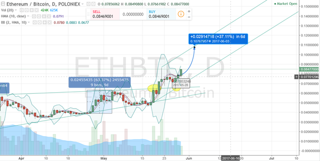 I think ETH continues to outpace until at least market cap parity are reached for starters.