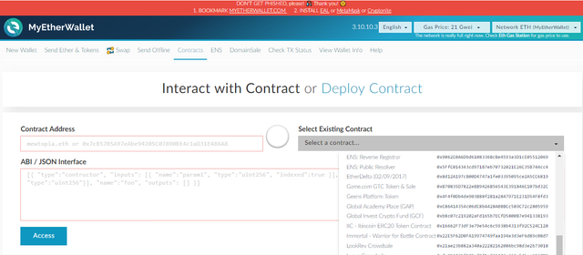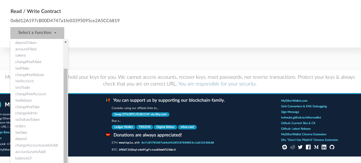 Step 1: Go to https://www.myetherwallet.com/#contracts. Select the EtherDelta smart contract from the drop-down list. Following which, the other 2 fields get populated automatically.