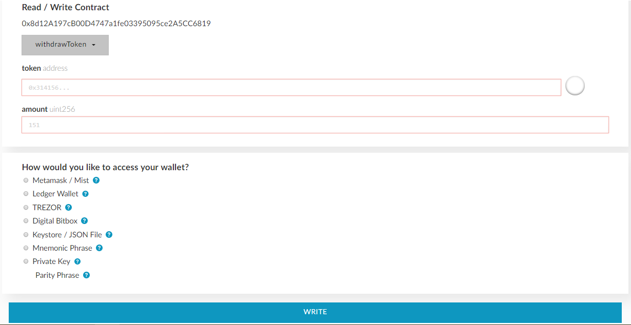 Step 8: Using token withdrawal as example, fill in "tokenaddress" per Step 4 and "amountunit256" per Step 6.