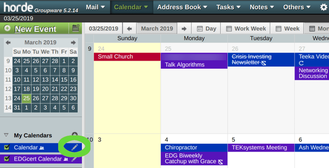 Once you log into your webmail account, tell it that you want to use the Horde interface. Click on Calendar at the top, then click on the pencil next to the calendar you want to sync with on the left.
