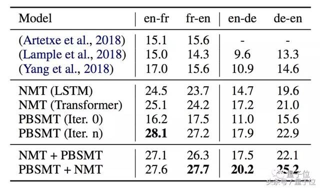 加上回译的PBSMT,几乎比前辈的成绩提升了一倍。NMT的表现也不差。