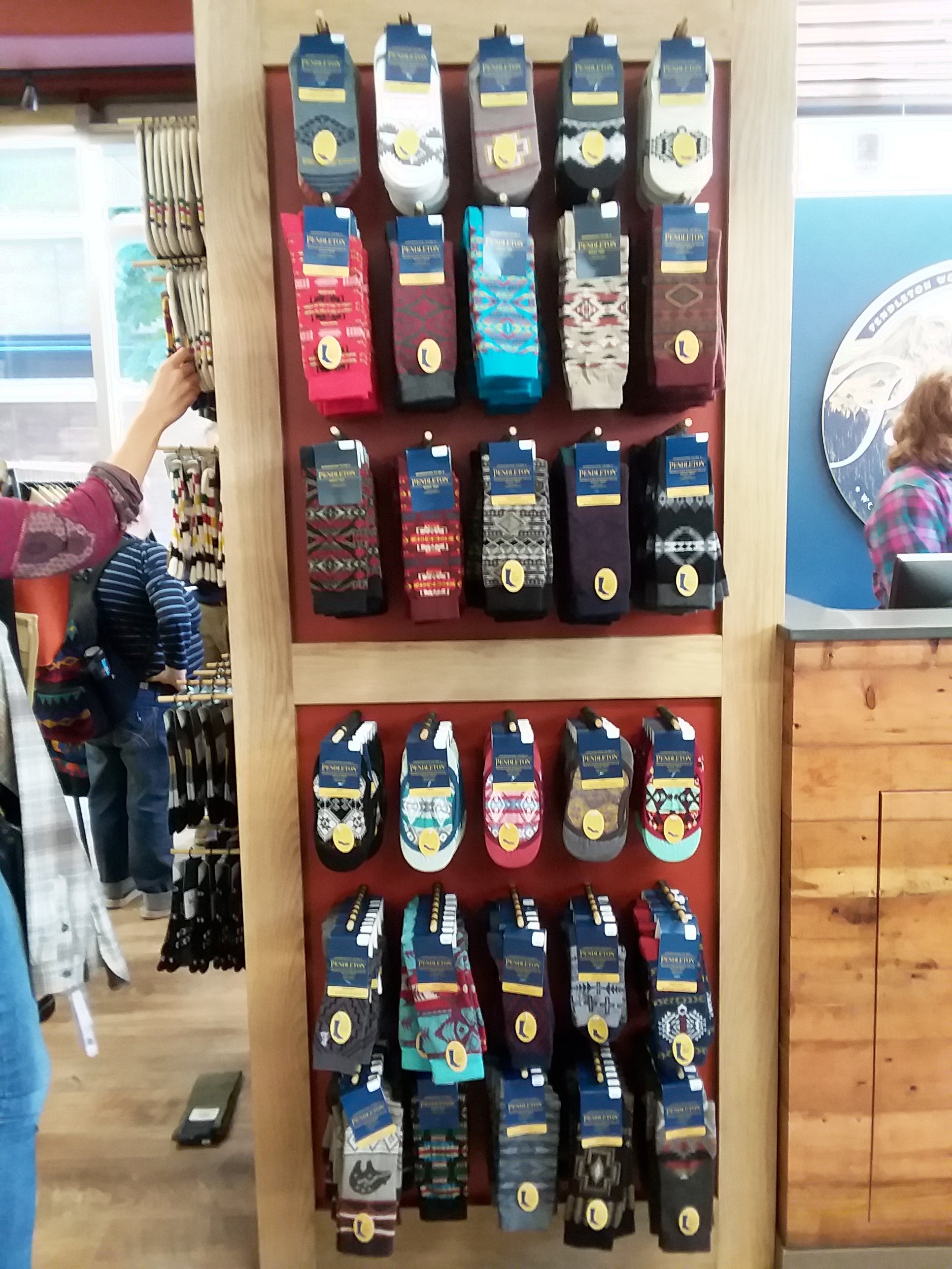 ABOVE: Start in the back of the store with a display of our National Parks product line. Each color scheme in the photo above represents a different park. Pendleton has been making product for the National Parks Service for over a century.