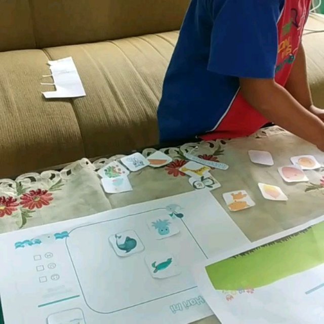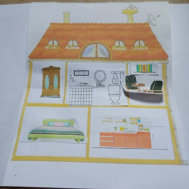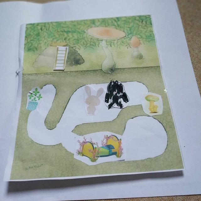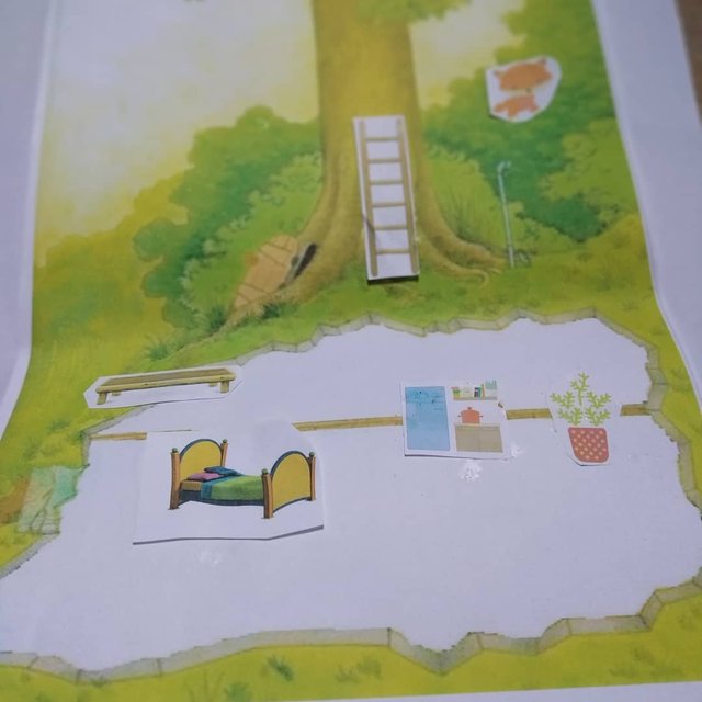 Sebenarnya kegiatan ini sederhana sekali. Hanya membantu menggunting gambar-gambar yang sudah tersedia, kemudian sediakan lem di sebelahnya. Faza mulai berkreasi dengan gambar-gambar yang cukup imajinatif. Seperti rumah dan perabot di dalamnya. Di mana letak kamar mandi, rak buku, dan sofa. Rumah pohon rubah, rumah kelinci di dalam tanah. Tentu saja dengan penghuninya juga. .