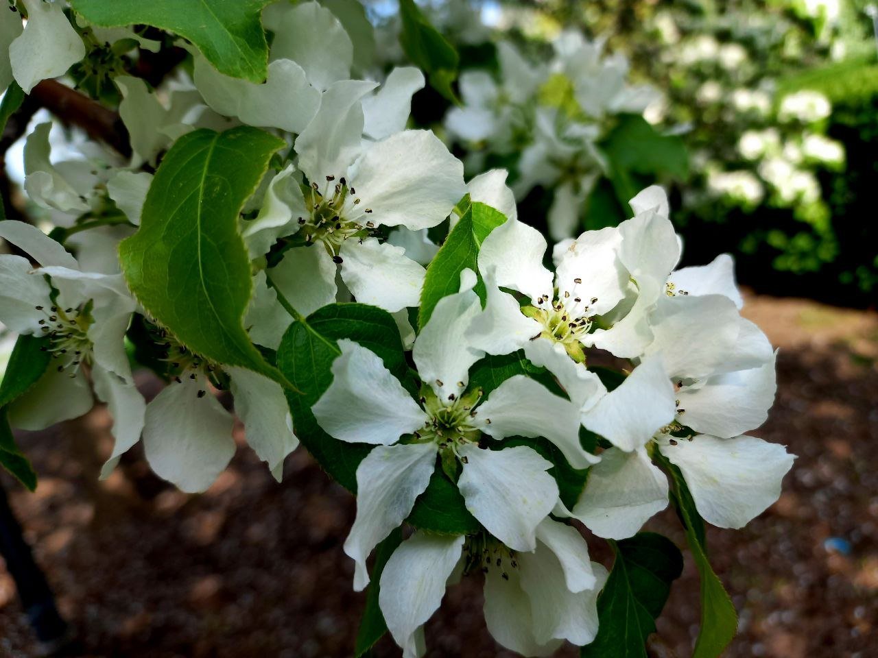 As sunlight filters through the branches, it catches the dewdrops resting on the petals, transforming them into tiny jewels that sparkle like stars against the azure sky. The gentle rustle of leaves accompanies the soft sighs of the blossoms, as if they are sharing secrets with the wind. Bees flit from flower to flower, their industrious hum adding a lively rhythm to this serene tableau.